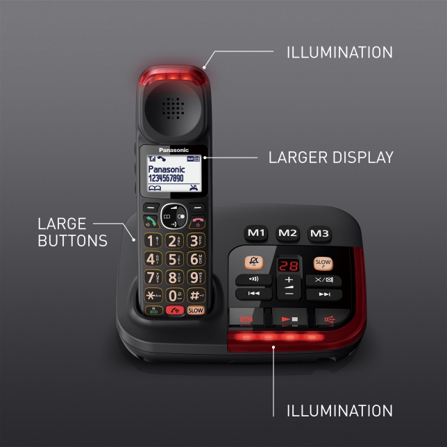 Panasonic KX-TGM420EXB Bežični telefon je dizajniran imajući na umu pristupačnost. 20% je širi i 48% deblji od naših konvencionalnih telefona*, tako da ga je teško izgubiti i lako ga je držati. Veći, osvetljeni tasteri su lakše vidljivi - kao i veći tekst na ekranu. Popularne funkcije imaju namjenske tastere koji život čine još lakšim.
